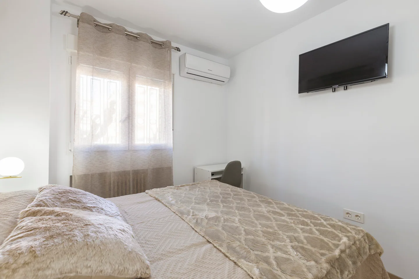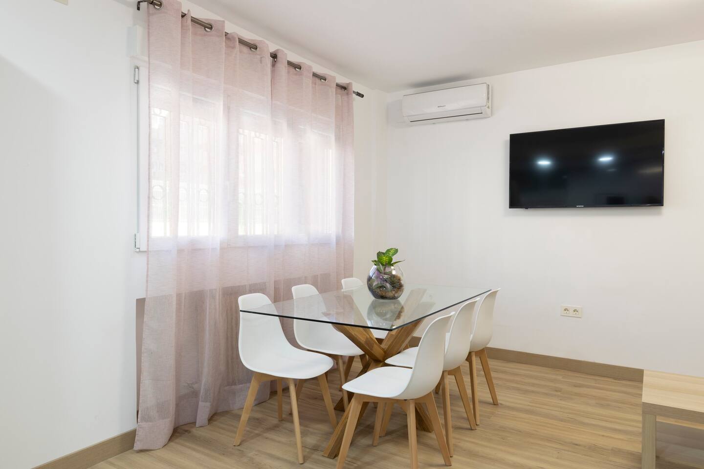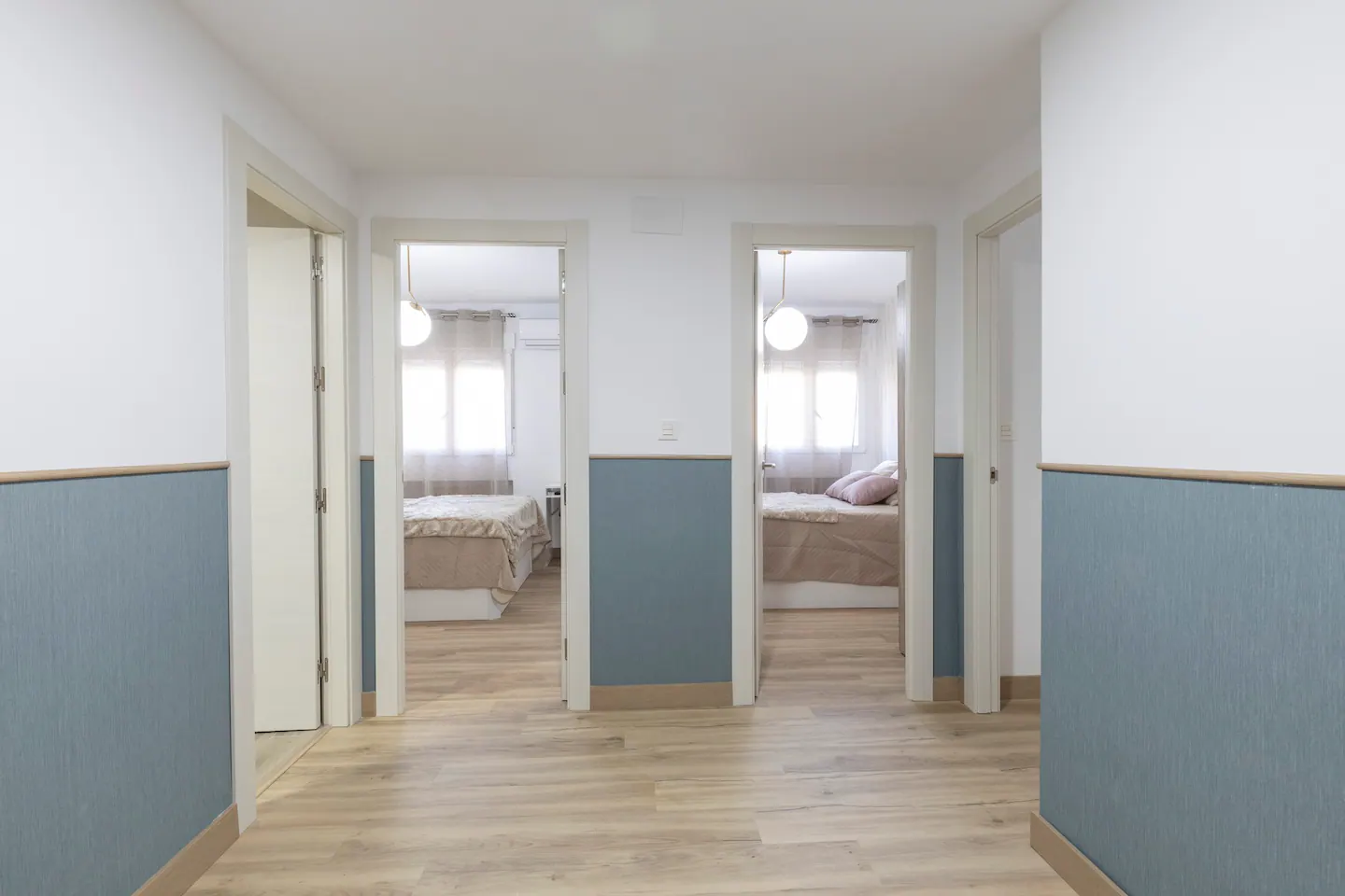 Alojamiento distribuido en tres grandes dormitorios, con colchón de alta gama de 1,50cm,zona de trabajo, televisión, calefacción y aire acondicionado en cada habitación, el salón tiene sofá cama de gran calidad, cocina completamente equipada y dos baños completos para evitar largas esperas en la ducha.